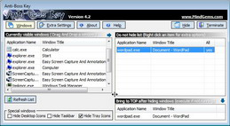 Usually you would not like to hide Explorer and other common windows that may not reveal sensitive information. In order not too look too suspicious you can set those windows not to be hidden when the boss key shortcut is hit. This can be done in the Windows tab. All visible windows are listed on the left. You can drag a window to the "Do not hide list" in order to keep it visible.