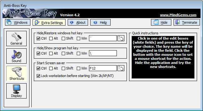 - Bosskey hot-key to lock workstation and start screen saver automatically